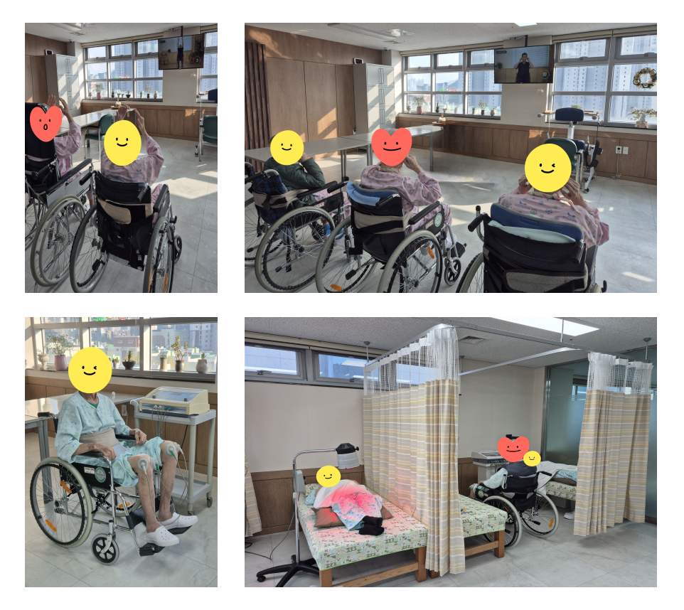 여러 어르신들 함께 물리치료실에 모셔서 서비스 제공해드리고 있으며 어르신의 신체 상태, 욕구 등을 반영하여 각자 어르신에 맞게 서비스 제공해드리고 있습니다.
