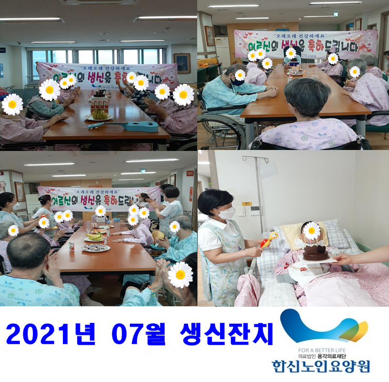 2021년 7월 2일 각 층 홀과 생활실에서 어르신 생신잔치를 실시하였습니다. 어르신들 모두 즐거운 시간 보내시면서 원에서 준비한 다과를 맛있게 드셨습니다. 생신을 맞이하신 어르신들 모두 다시 한번 더 생신 축하드려요~♥♥><