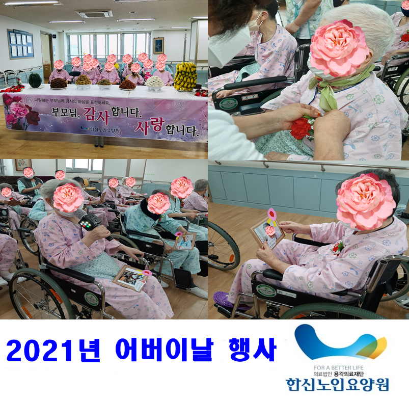 2021년 5월 7일 각 층 홀에서 어버이날 행사를 실시하였습니다. 어르신들께 카네이션도 달아드리고 직원들이 꾸민 어르신 가족 사진 액자도 선물로 드렸습니다. 어르신들께 감사와 존경의 마음을 담아 직원들이 큰절을 올리는 뜻깊은 시간이었습니다. 어르신들 우리 오래오래 행복하게 살아요~♥♥