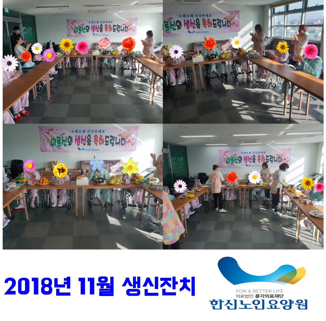 2018년 11월 30일 7층 프로그램실에서 어르신 생신잔치를 실시하였습니다. 어르신들 모두 즐거운 시간 보내시면서 원에서 준비한 다과를 맛있게 드셨습니다. 9월 생신을 맞이하신 어르신들 모두 다시 한번 더 생신 축하드립니다 ^^