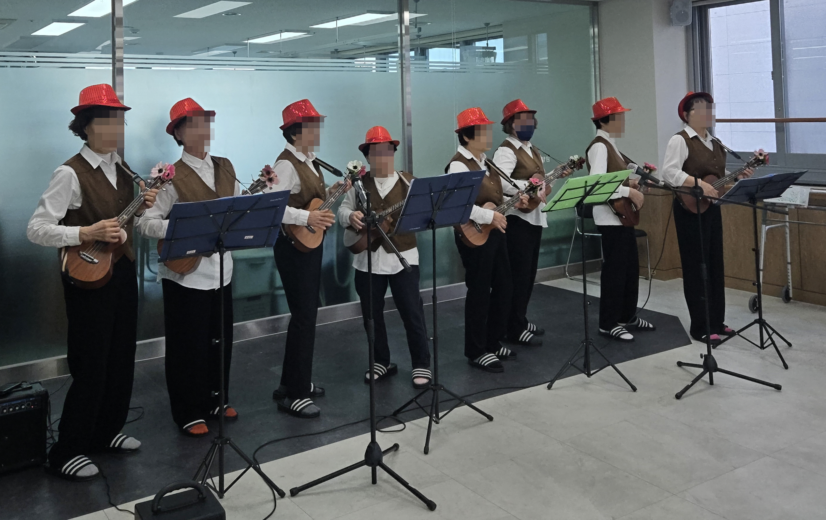 먼저, 생신축하 노래와 함께 단체사진 촬영을 진행하였으며, 이후 내당노인복지관의 우크렐레 봉사단 - "룰루렐레" 봉사팀과 연계하여 즐거운 공연을 관람하였습니다.
