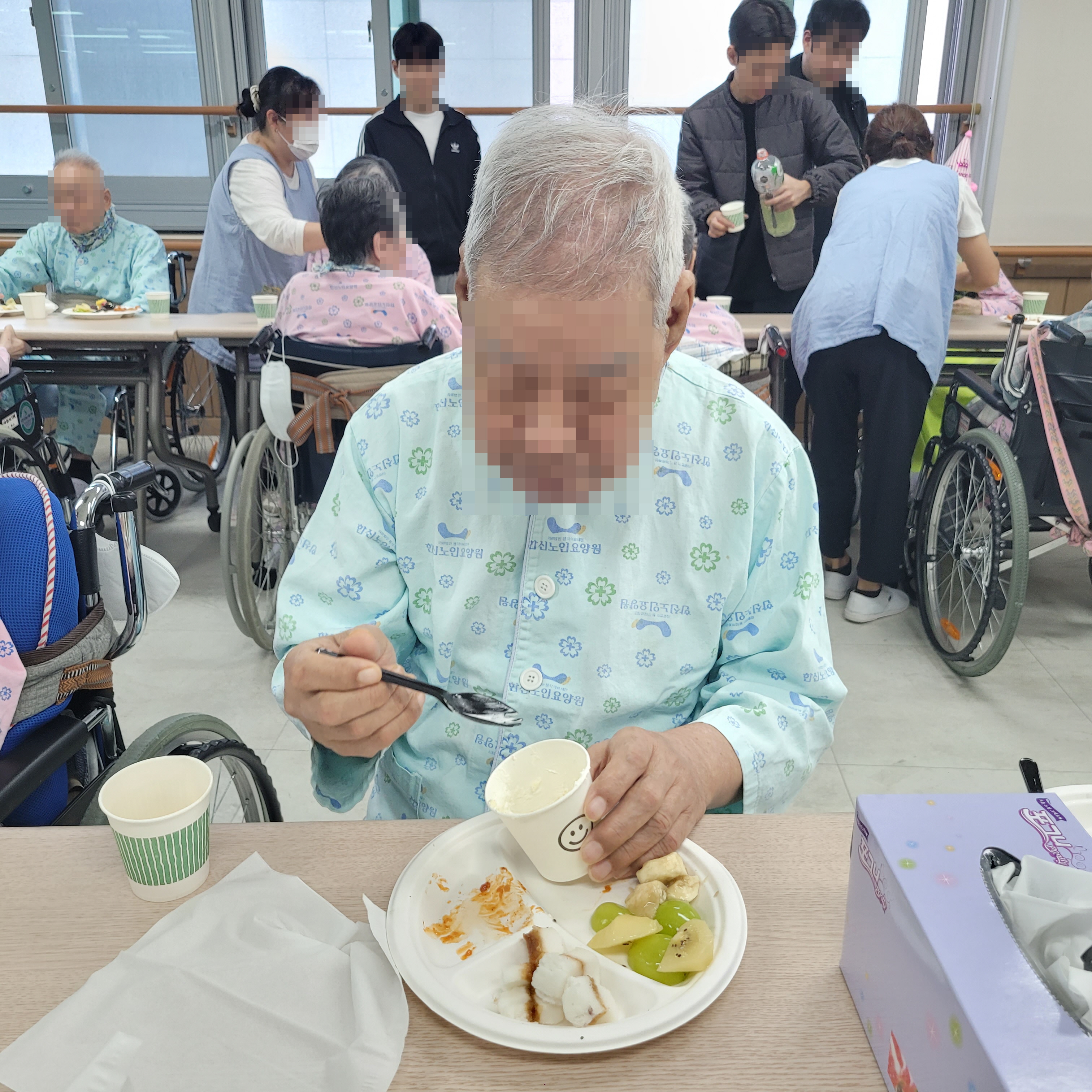 이후 다양한 다과와 케이크, 치킨 등을 준비하여 모두 맛있게 드셨으며, 이후 담소를 나누다 생활실로 돌아가셨습니다.