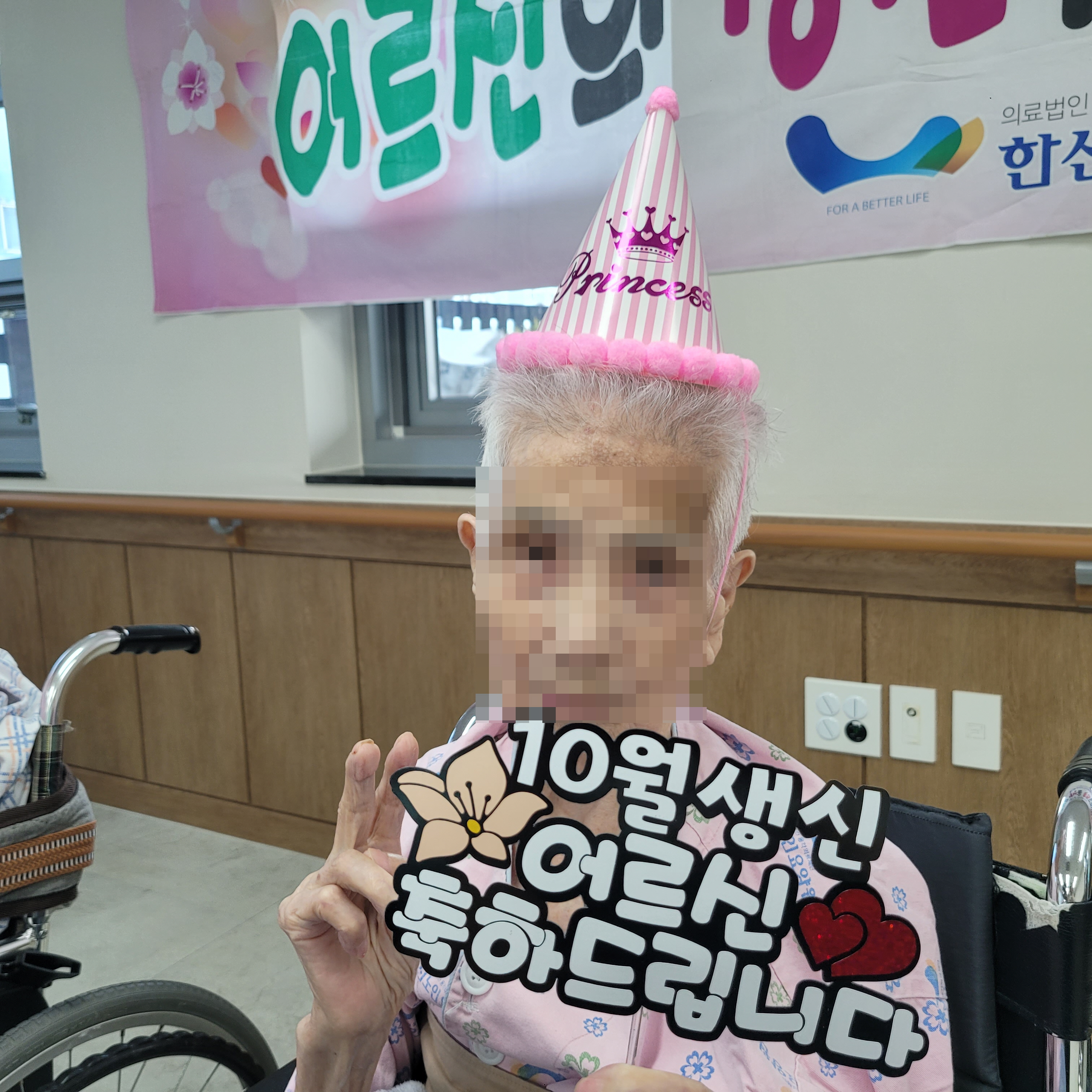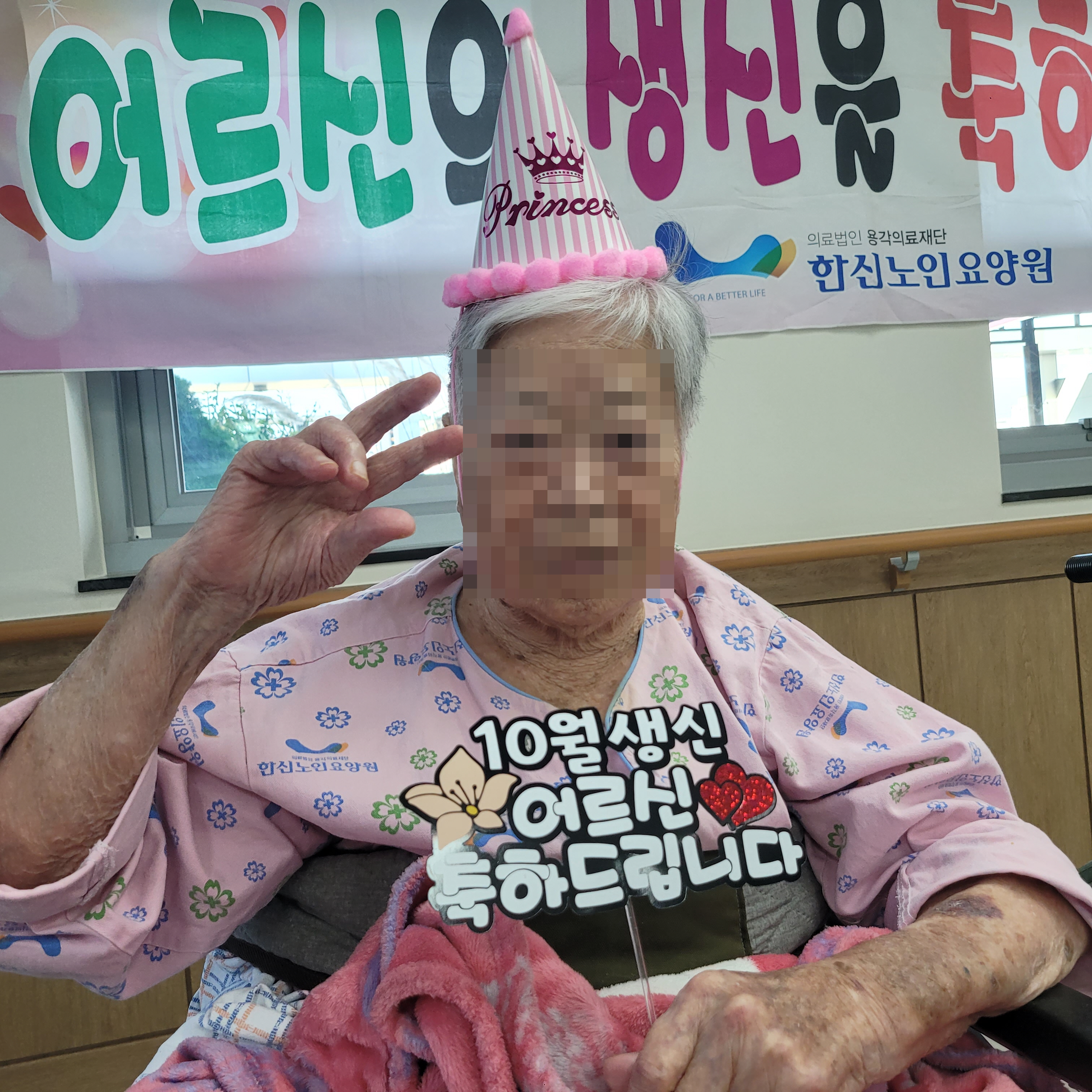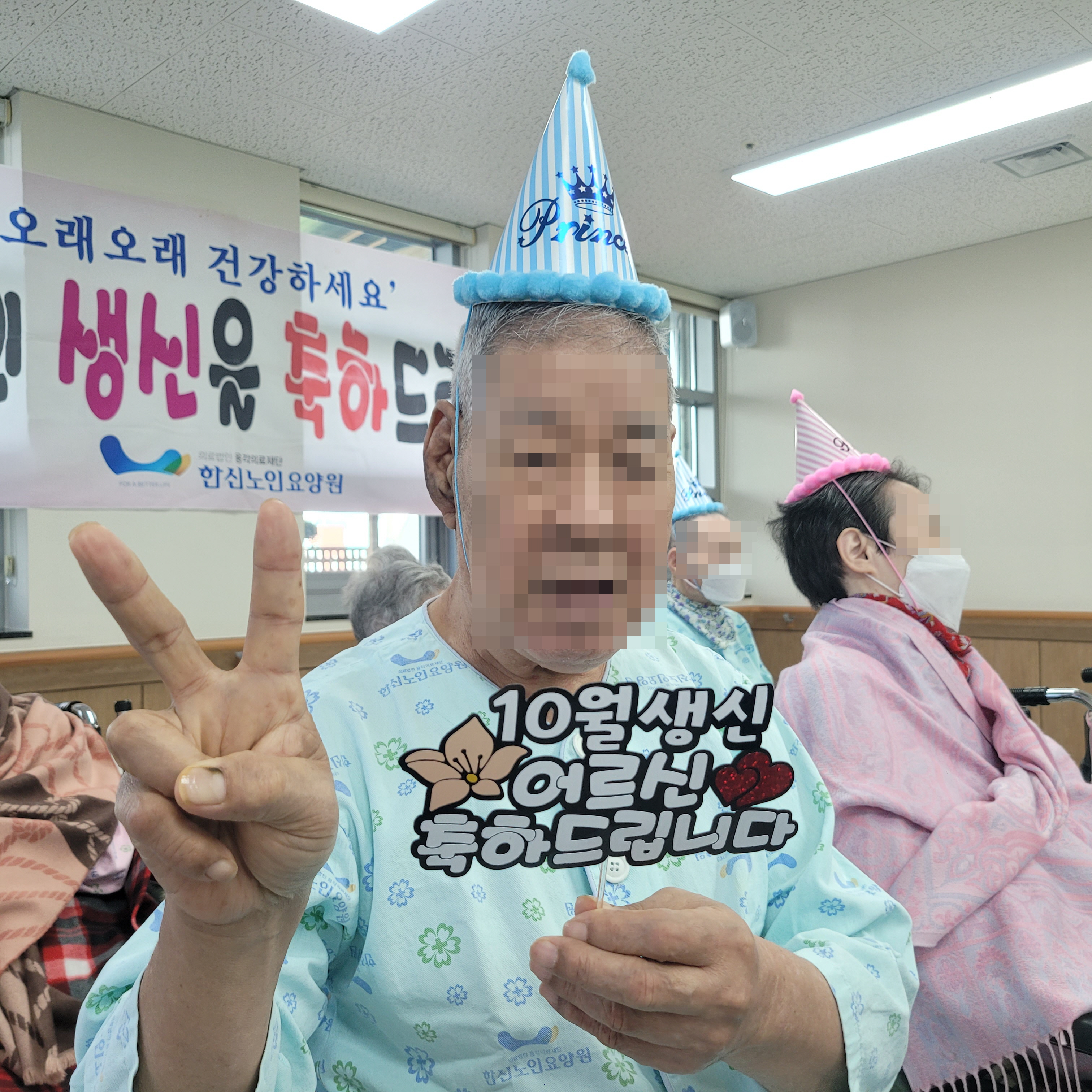 10월 생신인 어르신들 다시 한번 축하드리며 한신노인요양원에 계신 어르신 모두 건강하고 행복하게 지내시길 바랍니다.