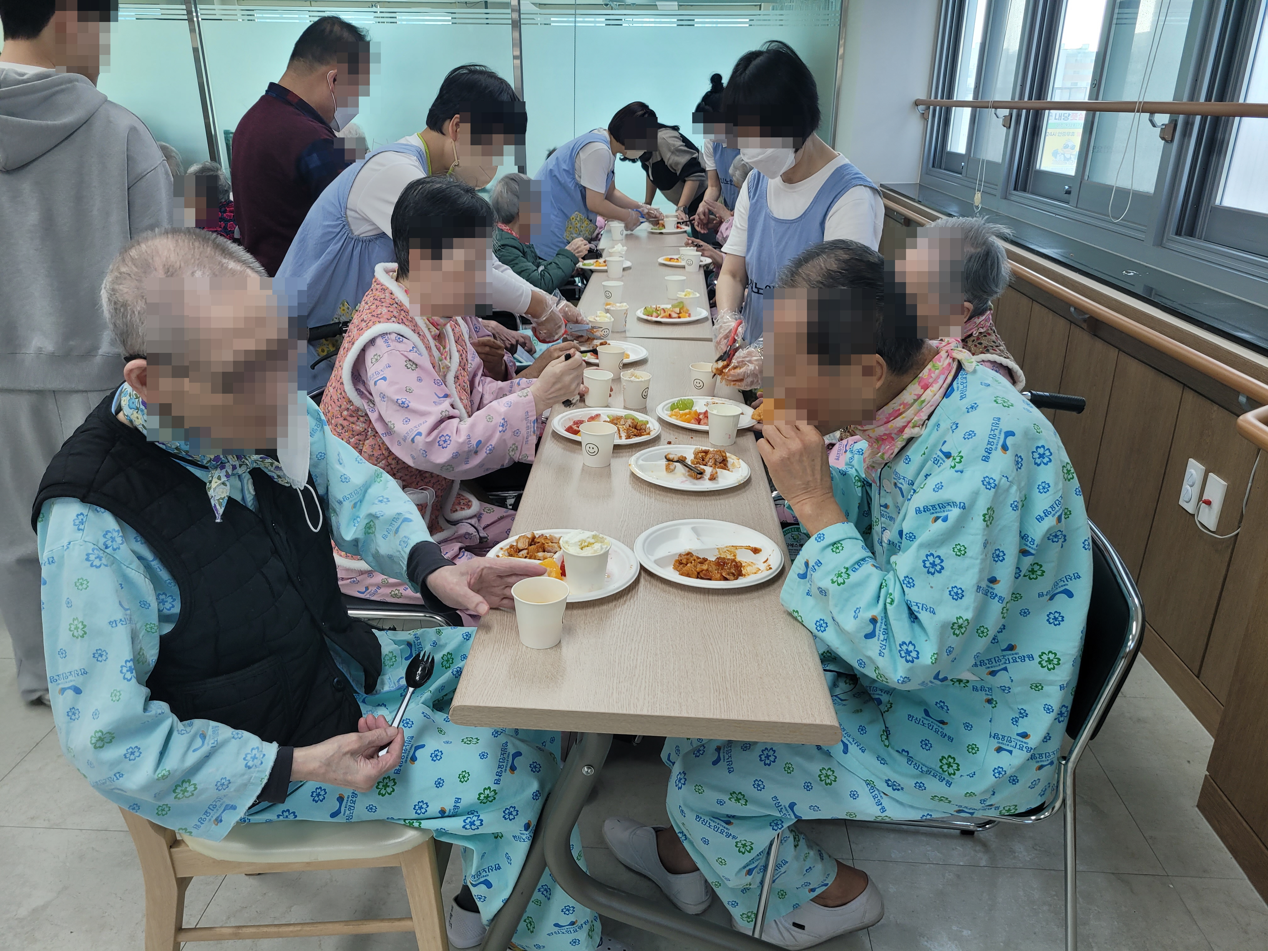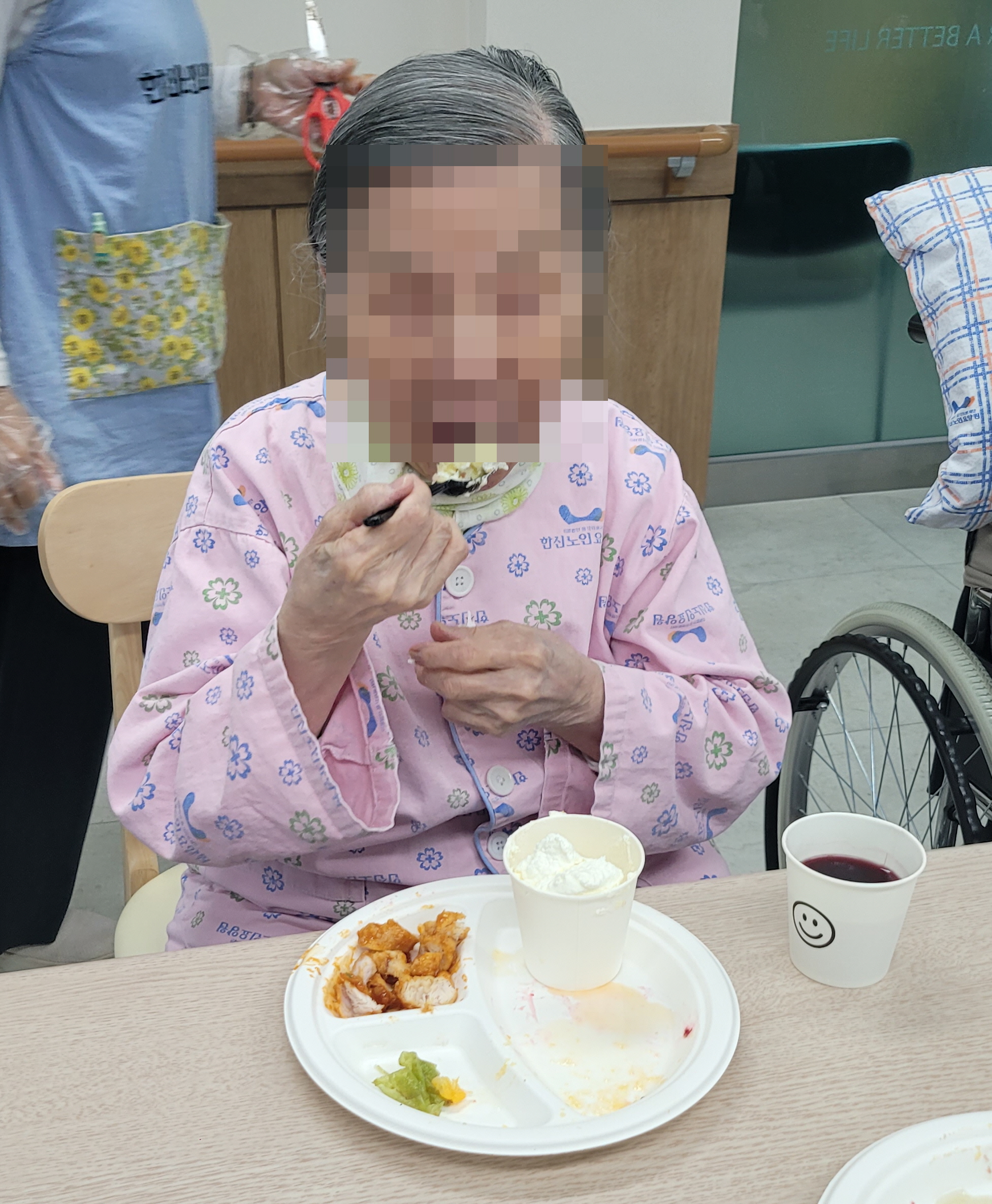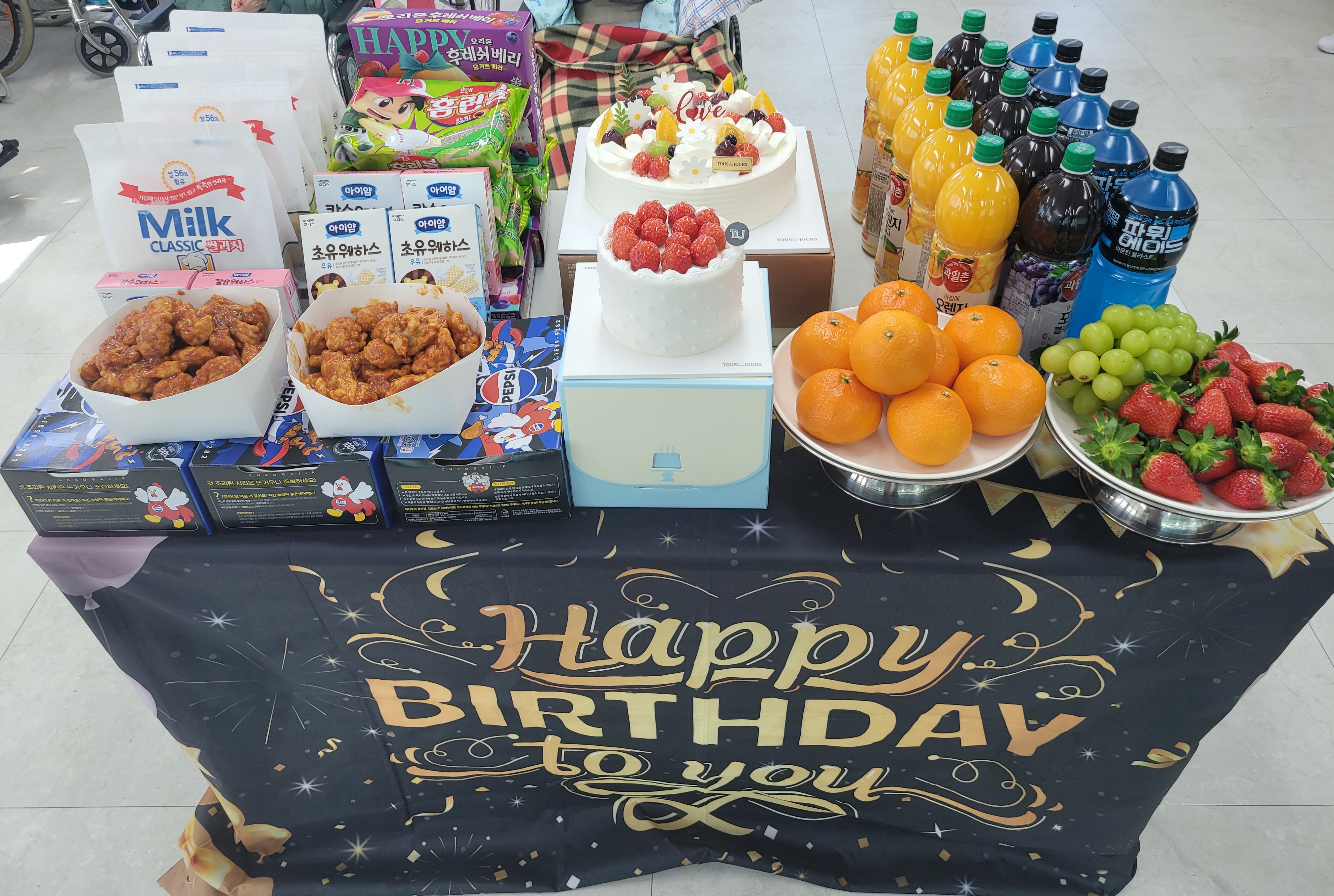 이후 음료와 케이크, 치킨 등 준비한 다과를 모두 맛있게 드셨으며, 담소를 나누다 생활실로 돌아가셨습니다.