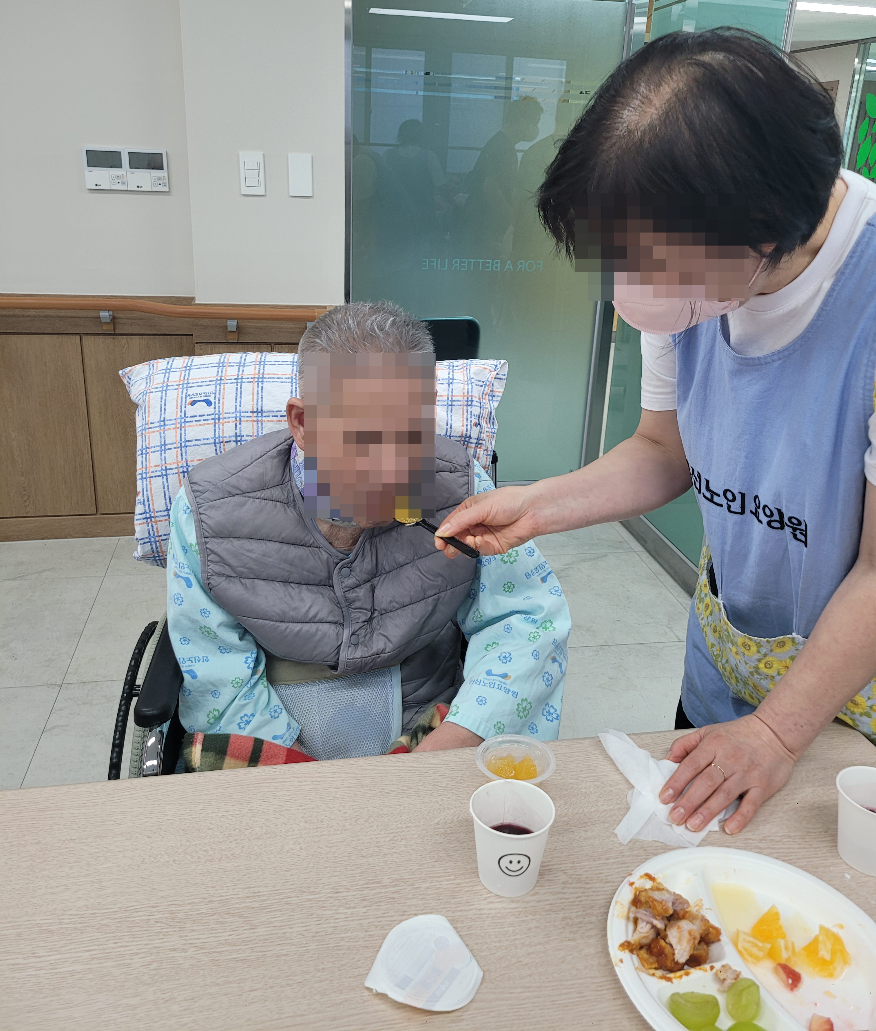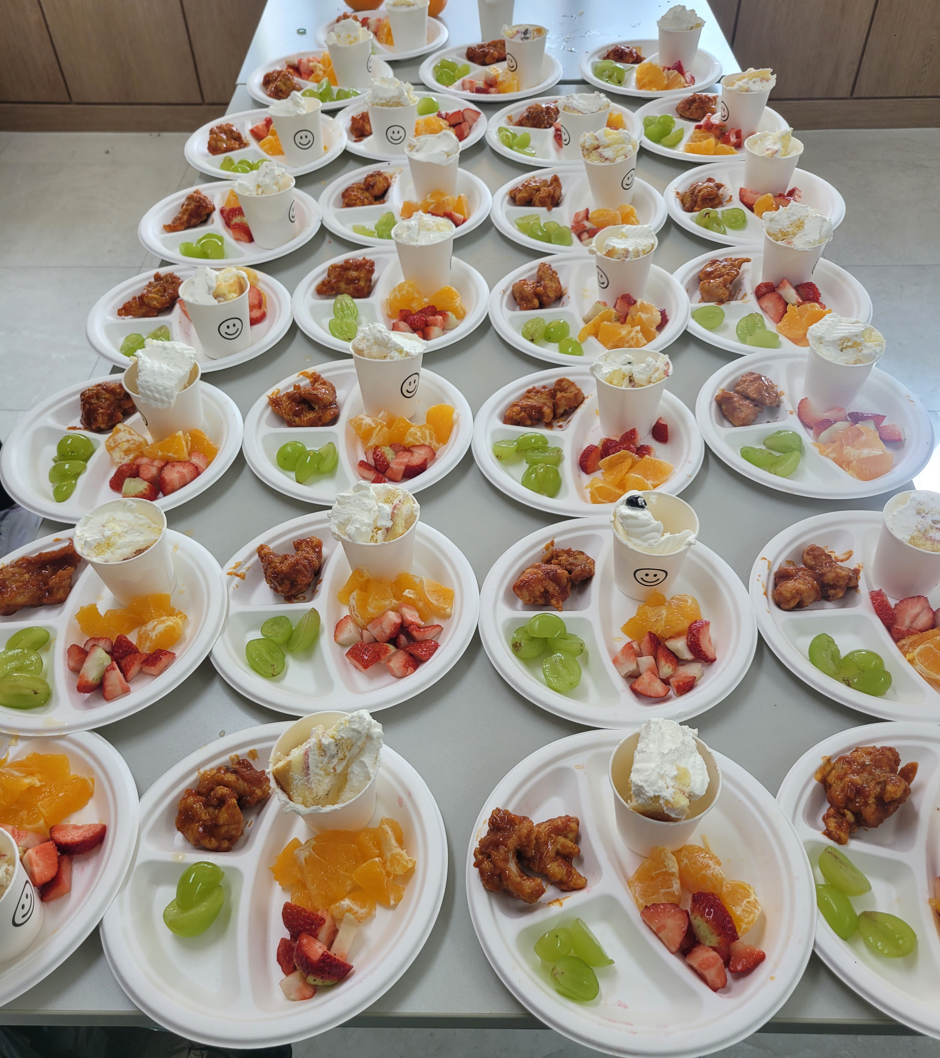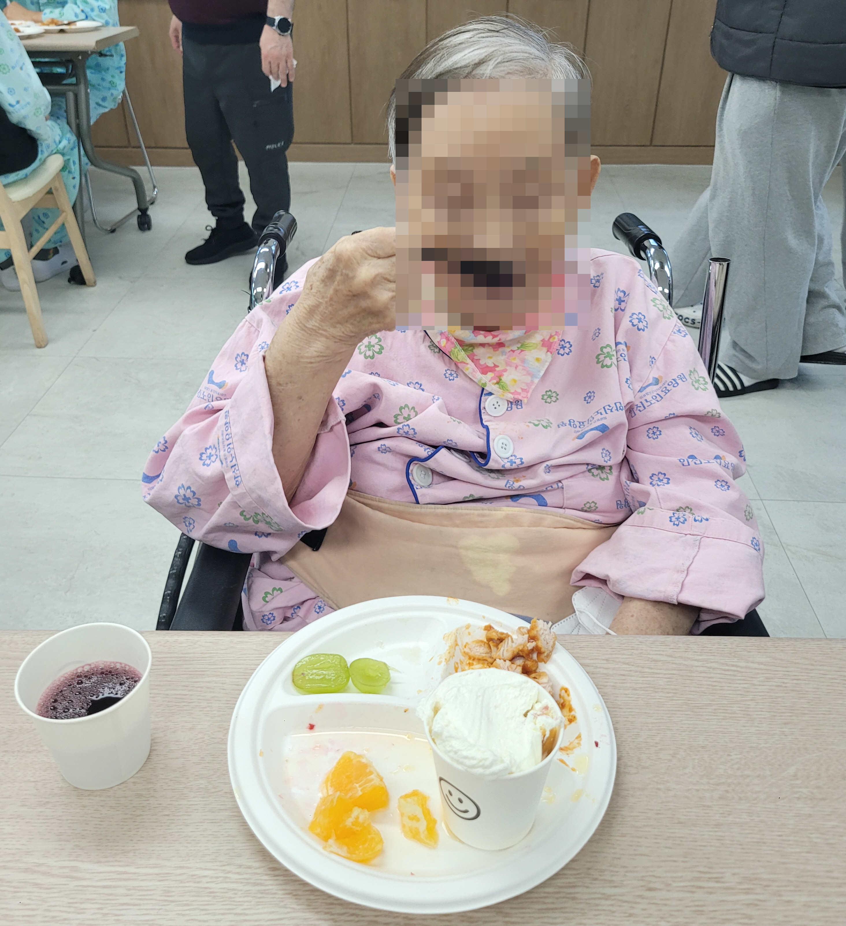 이후 음료와 케이크, 치킨 등 준비한 다과를 모두 맛있게 드셨으며, 담소를 나누다 생활실로 돌아가셨습니다.