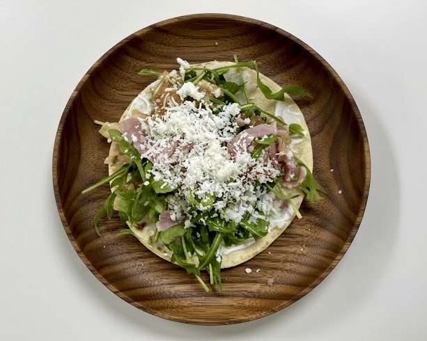 샤워크림, 루꼴라, 베이컨, 토마토가 올라간 또띠아 피자로 건강하고 맛있는 간식 시간이었습니다.