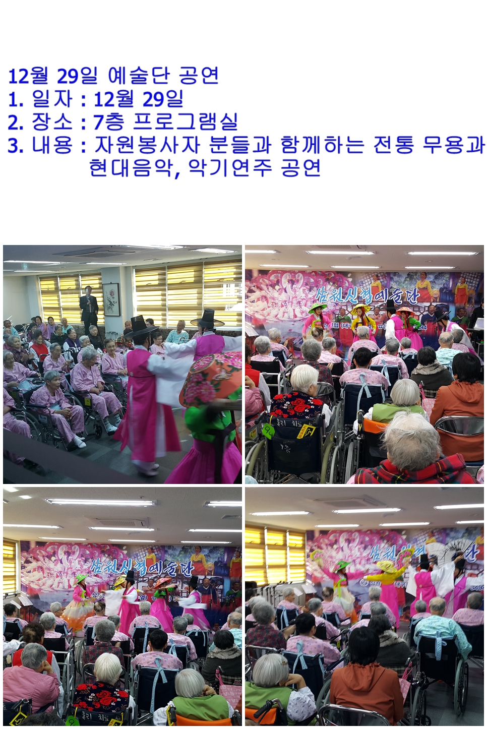 신협 예술단 공연(15.12.29) 한신노인요양원 04-21 1470 . 이전글1월 직원 월례회(16.01.04) 16.04.21 다음글달콤한 음악회 공연(15.12.22) 16.04.21 댓글 0 댓글목록 등록된 댓글이 없습니다.