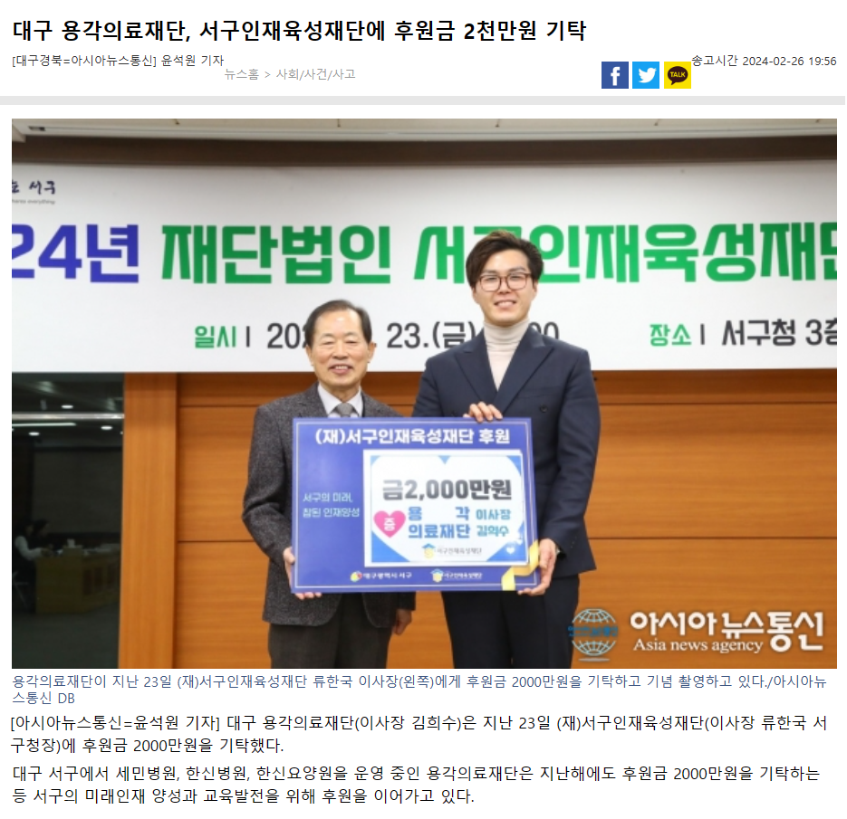 (재)서구인재육성재단은 대구 서구의 미래를 이끌어갈 창의적이고 유능한 인재 양성과 우수 학생 작학금 지급, 교육 발전을 위해 다양한 사업에 힘쓰고 있는 재단으로 이러한 서구인재육성재단에 도움이 되고자 저희 용각의료재단이 후원금을 기탁하기로 결정했습니다.