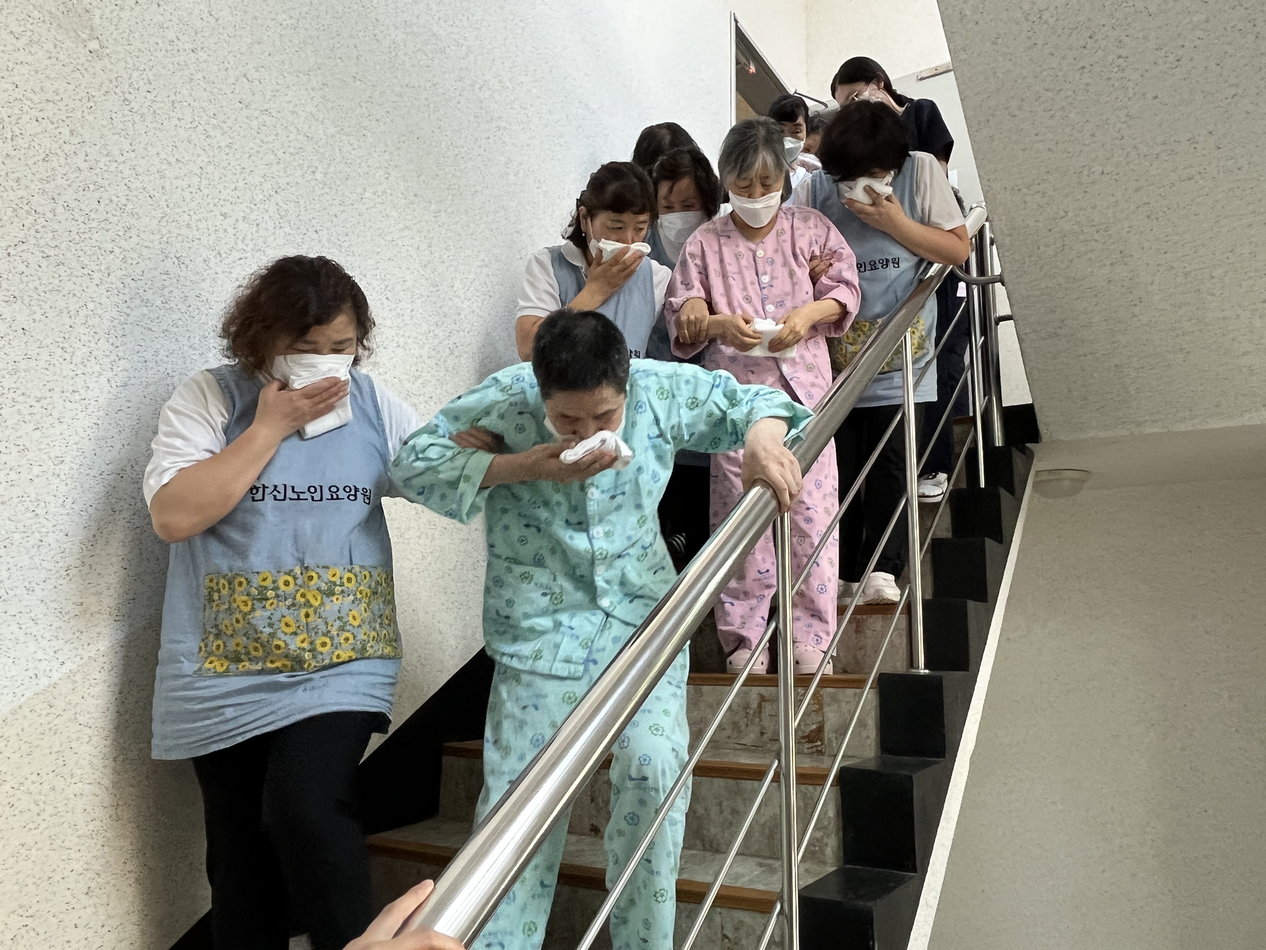 2층에서 화재 발생 시 대응 방법과 대피로 훈련을 진행한 후
