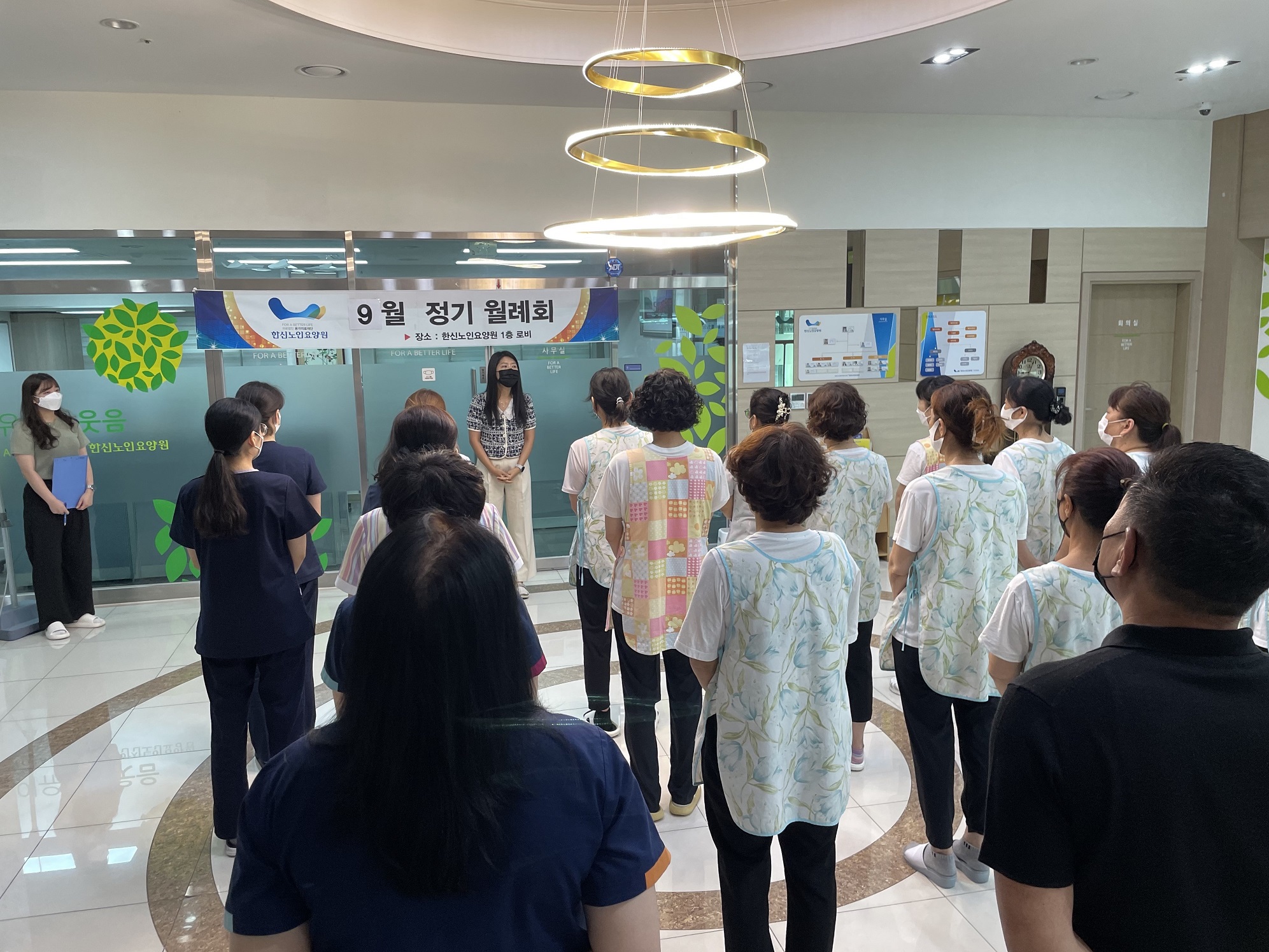 1 2023년 9월 6일(수) 한신노인요양원 1층 로비에서 월례회를 실시하였습니다.