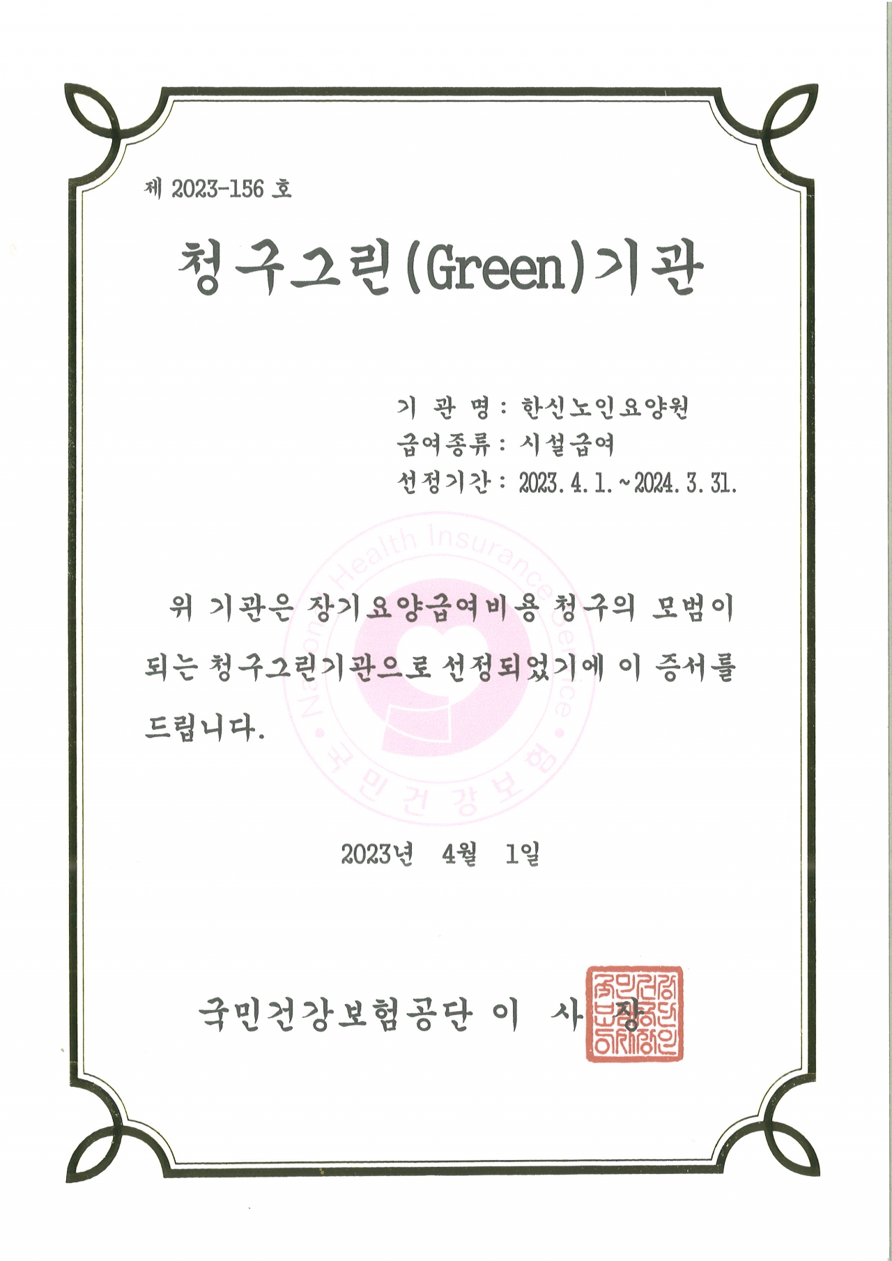 - 이전글한신노인요양원 장기요양기관 시설급여평가 최우수(평가등급 A) 23.04.28