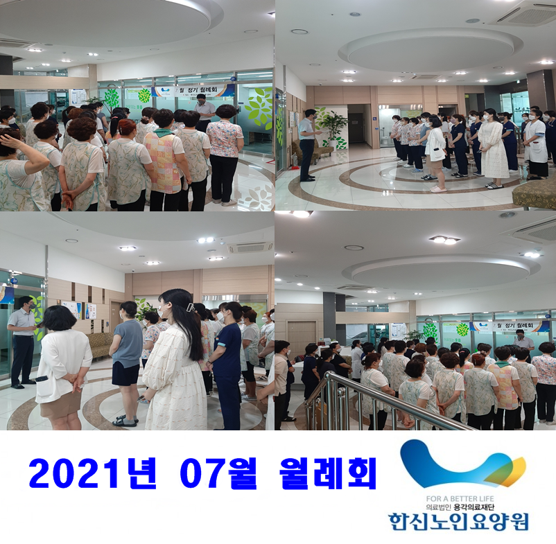 공지사항으로 신종 코로나 바이러스 안내, 안전사고 안내, 비접촉 면회 안내 등의 내용을 사무국장님께서 전체 직원에게 전달한 후 2021년 7월 월례회를 마무리하였습니다.