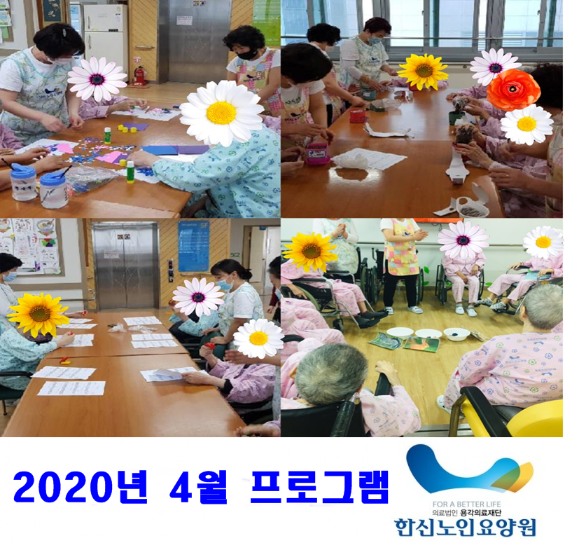 2020년 4월 프로그램 사진입니다. 동식물 모자이크, 모종심기, 동식물 관련 노래에 맞춰 악기 연주하기, 동물그림 바구니에 콩주머니 넣기 등 다양한 프로그램을 진행하였습니다. 어르신들 모두 즐거운 시간을 보내셨습니다~^^