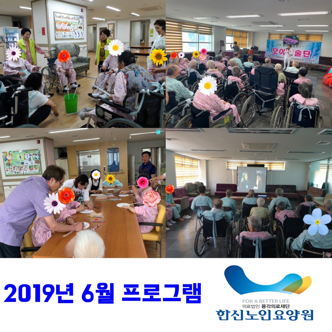2019년 6월 프로그램 사진입니다. 신문지 투호놀이, 부채만들기, 영화감상, 모아예술단 등 다양한 프로그램을 진행하였습니다. 어르신들 모두 즐거운 시간을 보내셨습니다~^^