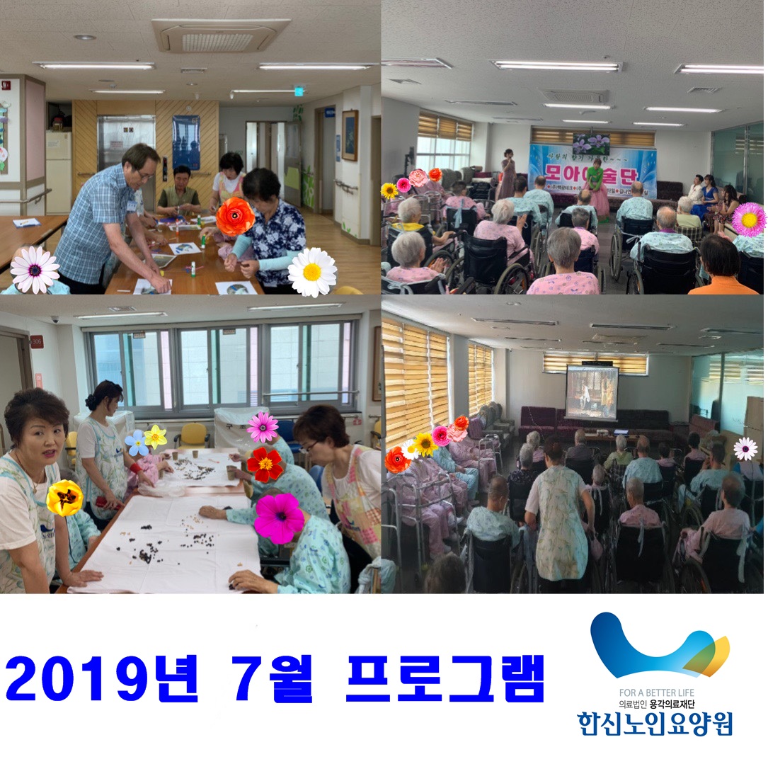 2019년 7월 프로그램 사진입니다. 고슴도치만들기, 콩고르기, 영화감상, 모아예술단 등 다양한 프로그램을 진행하였습니다. 어르신들 모두 즐거운 시간을 보내셨습니다~^^