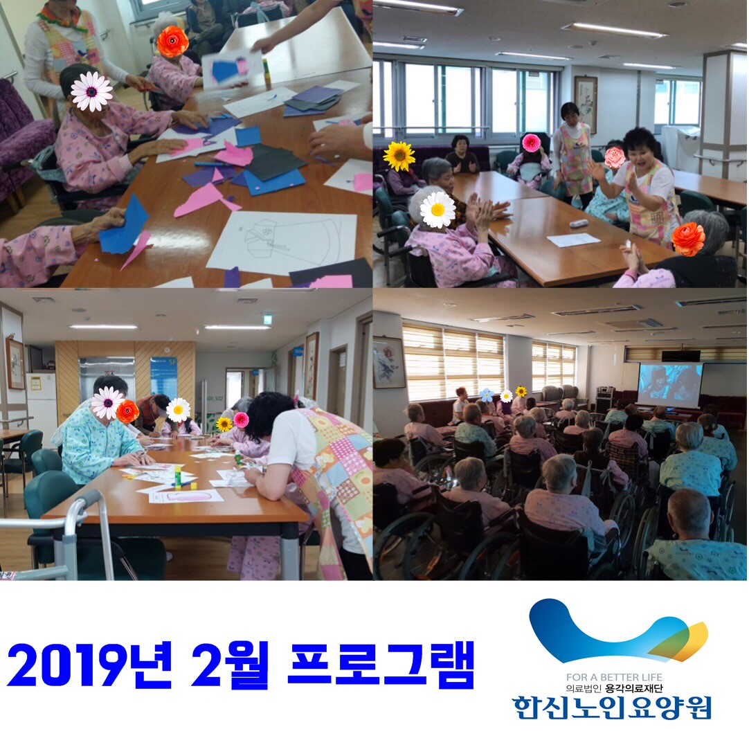 2019년 2월 프로그램 사진입니다. 한복 모자이크 만들기, 가요교실, 영화감상 등 다양한 프로그램을 진행하였습니다. 어르신들 모두 즐거운 시간을 보내셨습니다~^^