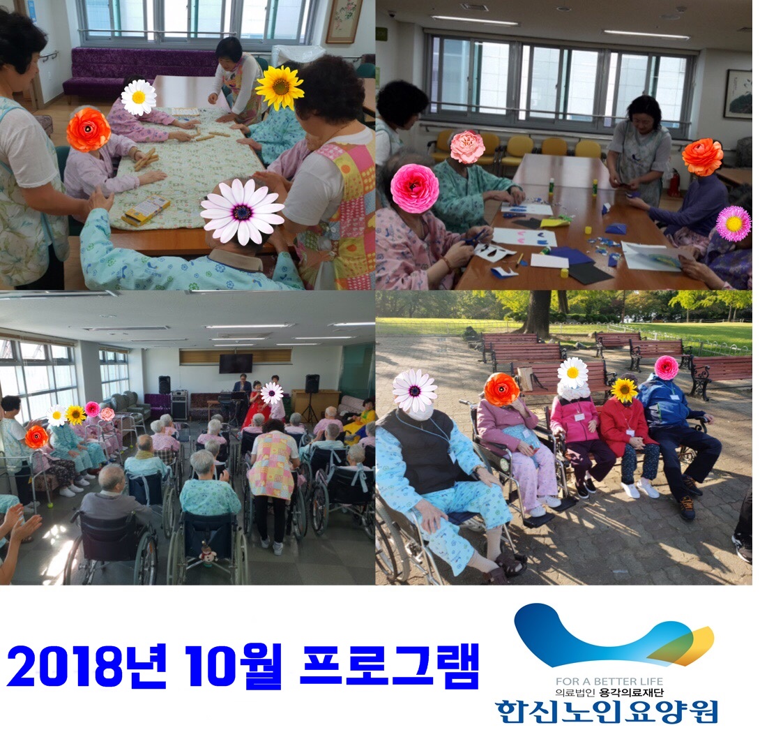 2018년 10월 프로그램 사진입니다. 종이 접기, 윷놀이, 달성공원 나들이 등 다양한 프로그램을 진행하였습니다.