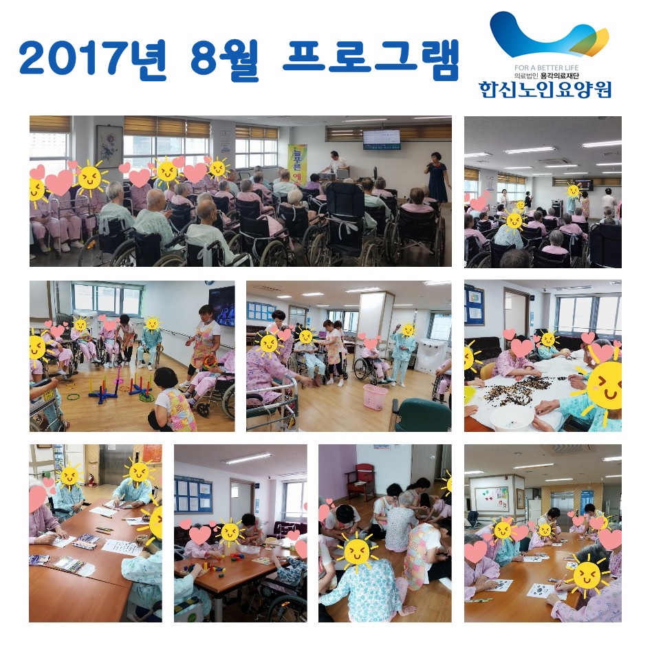 2017년 8월 프로그램 한신노인요양원 09-06 1223 2017년 8월 한달동안 진행한 프로그램 사진입니다. 어르신들 모두 즐겁게 잘 참여하셨습니다^^ 이전글11월 프로그램 17.01.04 다음글2017년 7월 프로그램 17.08.03 댓글 0 댓글목록 등록된 댓글이 없습니다.