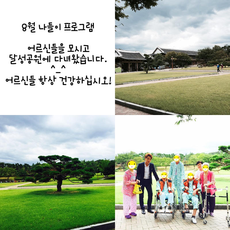 8월 나들이 프로그램 (2016.08.26) 한신노인요양원 09-02 1551 어르신들과 직원들이 함께 달성공원으로 나들이를 다녀왔습니다! 어르신들의 밝은 미소에 저희 직원들이 더욱 기뻐집니다^^ 어르신들 항상 행복을 가슴에 품고 살아가시길 바라겠습니다. 건강하십시오! 이전글9월 프로그램 16.09.30 다음글8월 프로그램 16.09.02 댓글 0 댓글목록 등록된 댓글이 없습니다.