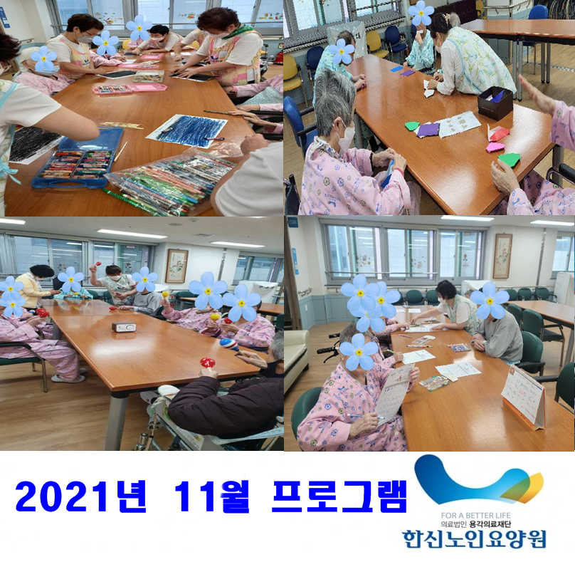 2021년 11월 프로그램 사진입니다. 까만 크레파스로 밤하늘 그리기, 밤송이 종이접기, 홍시 노래에 맞추어 마라카스 연주하기, 11월 달력만들기 등 다양한 프로그램을 진행하였습니다. 어르신들 모두 즐거운 시간을 보내셨습니다~ >O<!