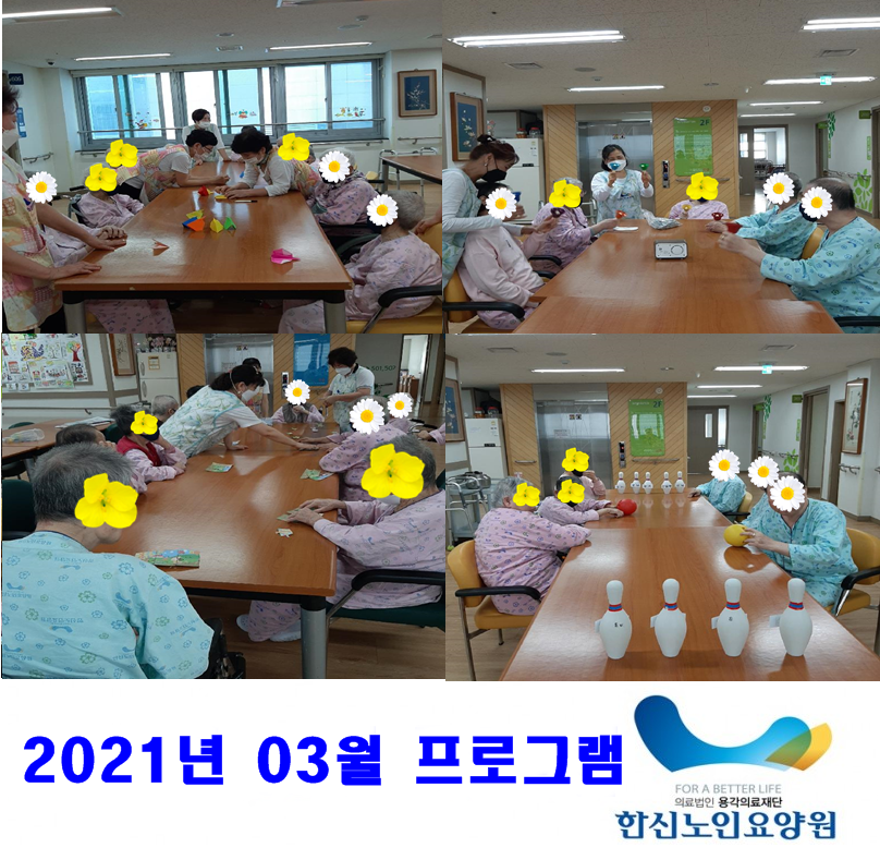 2021년 3월 프로그램 사진입니다. 병아리 종이접기, 동요'꽃밭에서' 들으며 핸드벨, 트라이앵글 합주하기, 봄 풍경 퍼즐 맞추기, 공 굴려서 새싹 글자 볼링핀 맞추기 등 다양한 프로그램을 진행하였습니다. 어르신들 모두 즐거운 시간을 보내셨습니다~**
