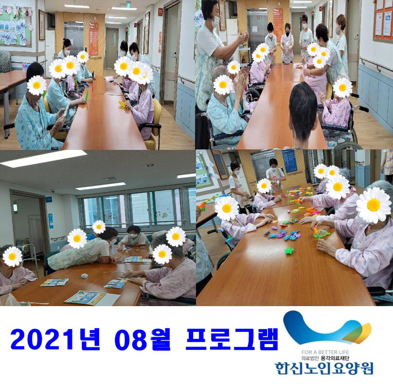 2021년 8월 프로그램 사진입니다. 고래 종이접기, 동요‘고기잡이’ 손 유희하기, 여름 바다 퍼즐 맞추기, 낚시놀이 등 다양한 프로그램을 진행하였습니다. 어르신들 모두 즐거운 시간을 보내셨습니다~ >O<