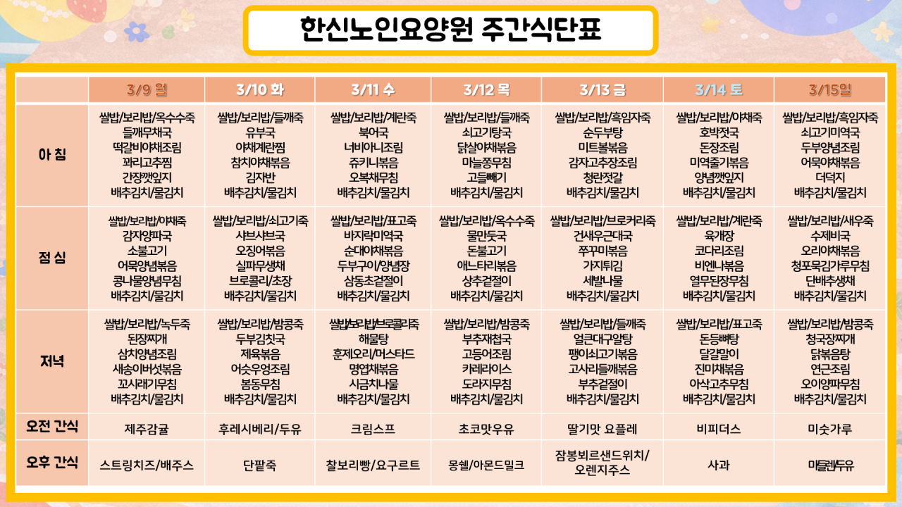 이번주에도 본 원 입소 어르신들을 위해 영양가득한 식사와 간식을 제공해드리겠습니다. 감사합니다.