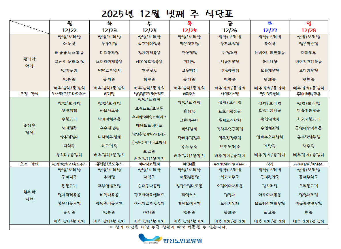 안녕하십니까. 25년 12월 4주차 주간식단표 입니다.