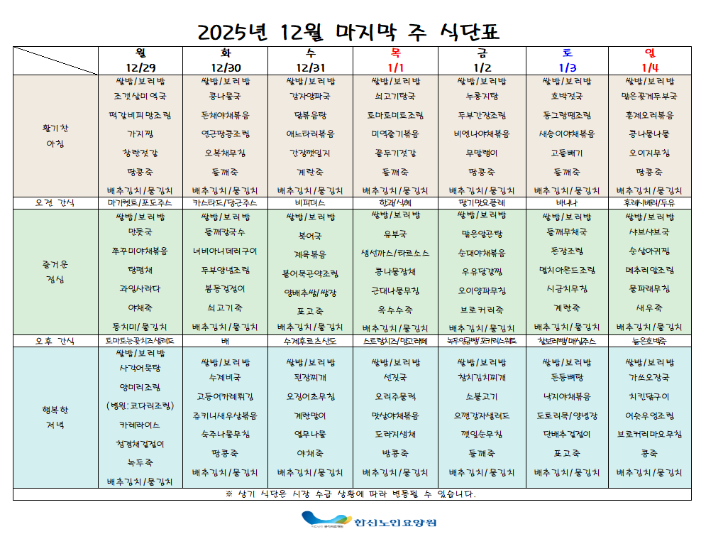 News forum안녕하십니까. 한신노인요양원 25년12월 5주차 주간식단표 입니다.