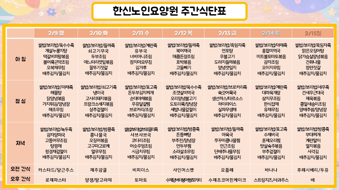 26년 2월2주차에도 본 원 입소 어르신들께 맛있는 식사와 간식을 제공해드리겠습니다.