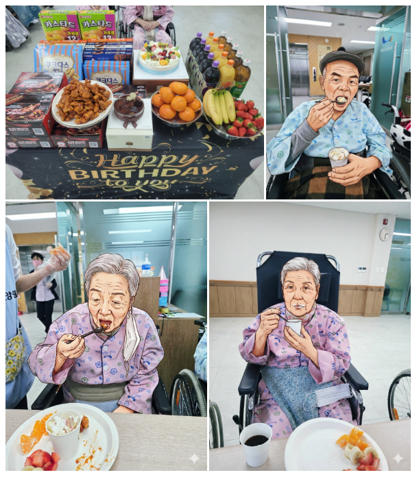 이후 음료와 케이크, 치킨 등 준비한 다과를 모두 맛있게 드셨으며, 담소를 나누다 생활실로 돌아가셨습니다.