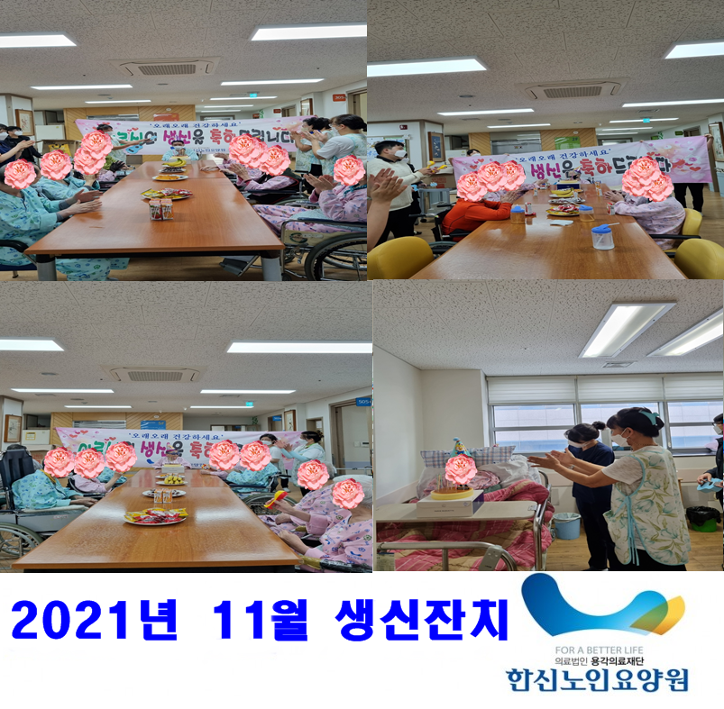 2021년 11월 5일 각 층 홀과 생활실에서 어르신 생신잔치를 실시하였습니다. 어르신들 모두 즐거운 시간 보내시면서 원에서 준비한 다과를 맛있게 드셨습니다. 생신을 맞이하신 어르신들 모두 다시 한번 더 생신 축하드려요~♥♥><