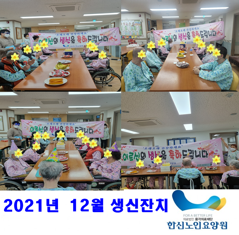 2021년 12월 10일 각 층 홀과 생활실에서 어르신 생신잔치를 실시하였습니다. 어르신들 모두 즐거운 시간 보내시면서 원에서 준비한 다과를 맛있게 드셨습니다. 생신을 맞이하신 어르신들 모두 다시 한번 더 생신 축하드려요~♥♥><