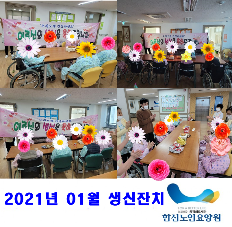 2021년 1월 8일 각 층 프로그램실에서 어르신 생신잔치를 실시하였습니다. 어르신들 모두 즐거운 시간 보내시면서 원에서 준비한 다과를 맛있게 드셨습니다. 생신을 맞이하신 어르신들 모두 다시 한번 더 생신 축하드립니다~♡