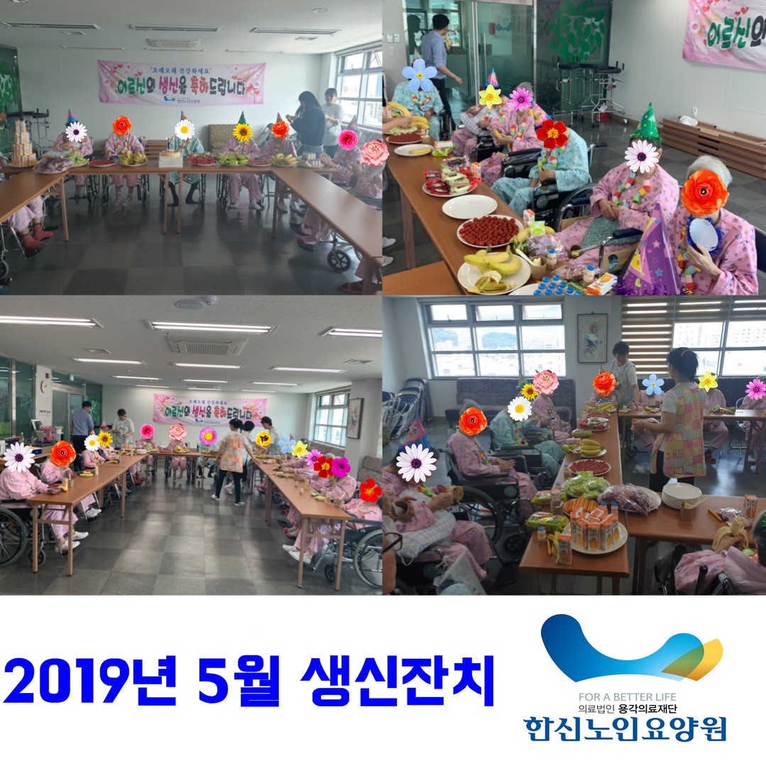 2019년 5월 31일 7층 프로그램실에서 어르신 생신잔치를 실시하였습니다. 어르신들 모두 즐거운 시간 보내시면서 원에서 준비한 다과를 맛있게 드셨습니다. 4월 생신을 맞이하신 어르신들 모두 다시 한번 더 생신 축하드립니다 ^^