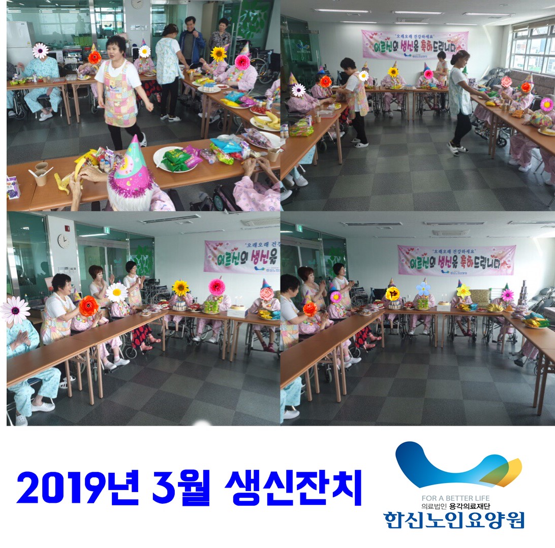 2019년 3월 29일 7층 프로그램실에서 어르신 생신잔치를 실시하였습니다. 어르신들 모두 즐거운 시간 보내시면서 원에서 준비한 다과를 맛있게 드셨습니다. 2월 생신을 맞이하신 어르신들 모두 다시 한번 더 생신 축하드립니다 ^^