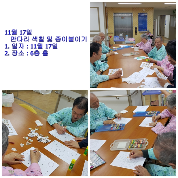 11월 만다라 색칠 및 색종이 붙이기 한신노인요양원 11-17 1542 . 이전글12월 소방안전교육 15.12.09 다음글11월 직원 월례회 15.11.02 댓글 0 댓글목록 등록된 댓글이 없습니다.