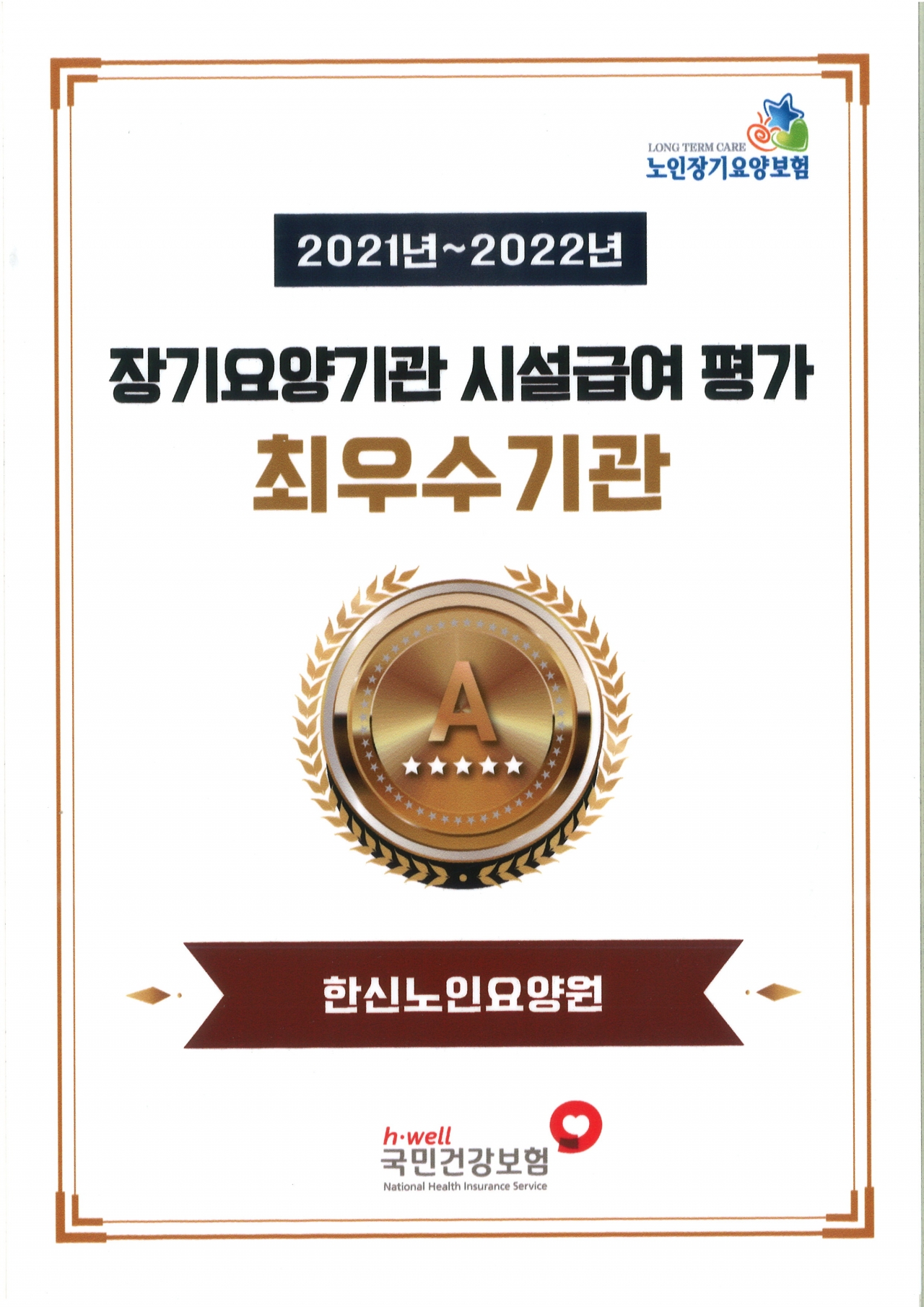 - 한신노인요양원 장기요양기관 시설급여평가 최우수(평가등급 A)