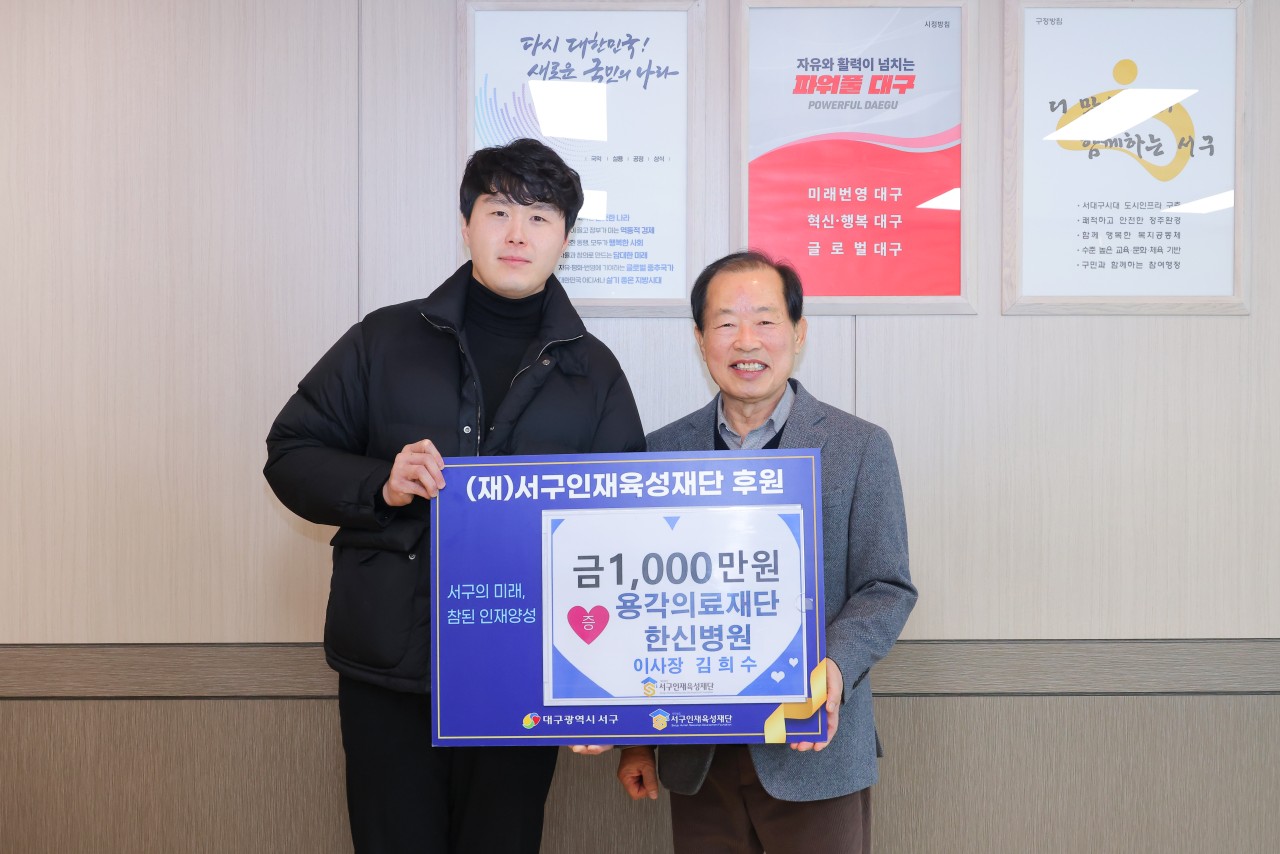 대구 서구의 인재 양성을 위해 다양한 사업을 하고 있는 (재)서구인재육성재단에 용각의료재단이 작년에 이어 올해에도 후원금 1천만원을 기탁하였습니다.