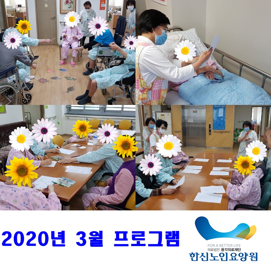 2020년 3월 프로그램 사진입니다. 낚시놀이, 시감상하기, 봄 풍경 색칠하기, 봄에 관련된 노래부르기 등 다양한 프로그램을 진행하였습니다. 어르신들 모두 즐거운 시간을 보내셨습니다~^^