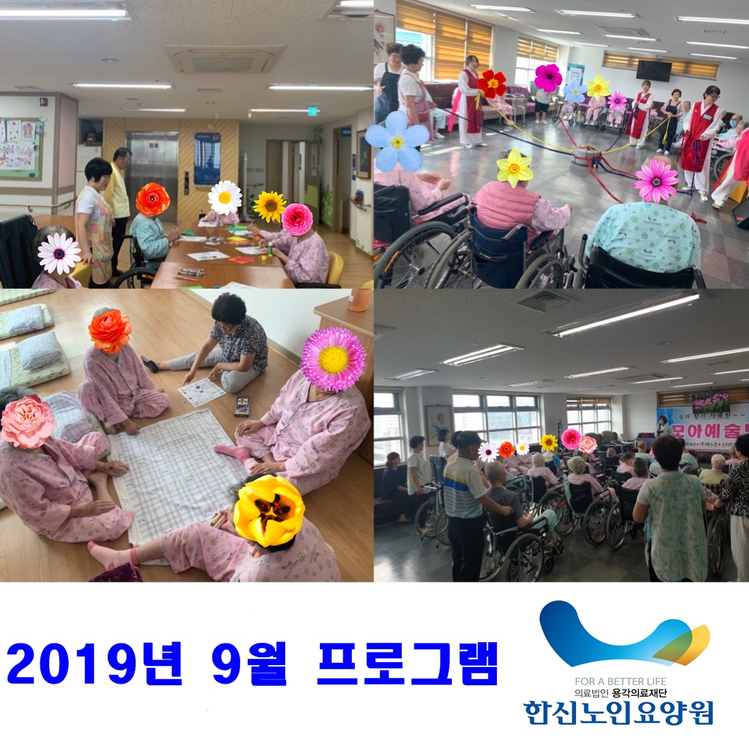 2019년 9월 프로그램 사진입니다. 한복모자이크,윷놀이, 노리소리, 모아예술단 등 다양한 프로그램을 진행하였습니다. 어르신들 모두 즐거운 시간을 보내셨습니다~^^