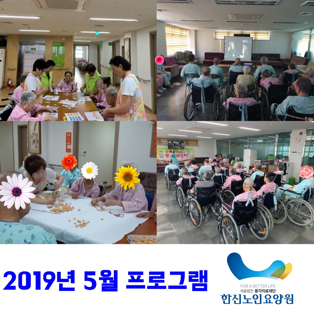 2019년 5월 프로그램 사진입니다. 뻥튀기 만들기, 숫자만큼 색종이 쌓기, 모아예술단, 그대를 사랑합니다(영화감상) 등 다양한 프로그램을 진행하였습니다. 어르신들 모두 즐거운 시간을 보내셨습니다~^^