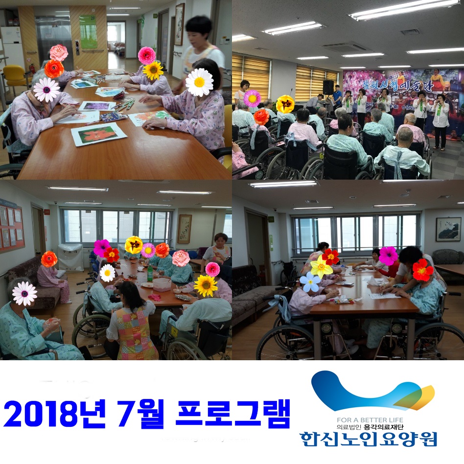 2018년 7월 프로그램 사진입니다. 수박화채 만들기, 꽃그리기 등 다양한 프로그램을 진행하였습니다.