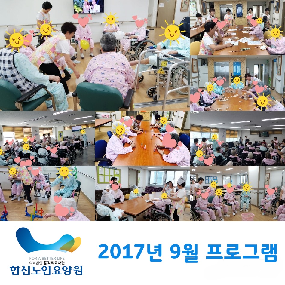 2017년 9월 프로그램 한신노인요양원 10-13 1151 2017년 9월 프로그램 사진입니다. 어르신들 모두 즐거운 시간을 보내셨습니다~^^ 이전글2017년 11월 프로그램 17.12.04 다음글2018년 6월 프로그램 18.07.08 댓글 0 댓글목록 등록된 댓글이 없습니다.