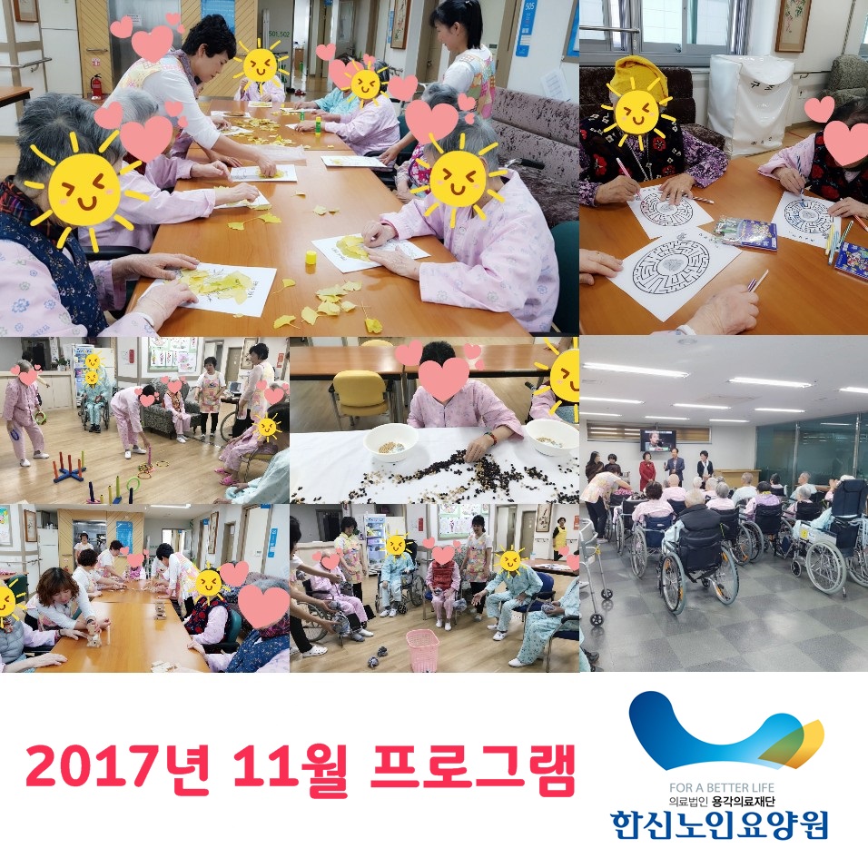 2017년 11월 프로그램 한신노인요양원 12-04 1100 2017년 11월 한달동안 진행한 프로그램들을 어르신들께서 재미있게 즐겨주셨습니다 ^^ 이전글2017년 12월 프로그램 18.01.25 다음글2017년 9월 프로그램 17.10.13 댓글 0 댓글목록 등록된 댓글이 없습니다.