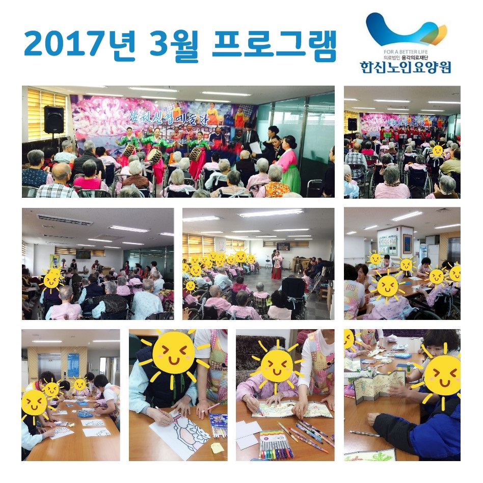 3월 프로그램은 미니병풍 만들기, 협동화 색칠하기, 넝쿨공연단, 신협공연단 등 다양한 프로그램을 실시하였습니다!