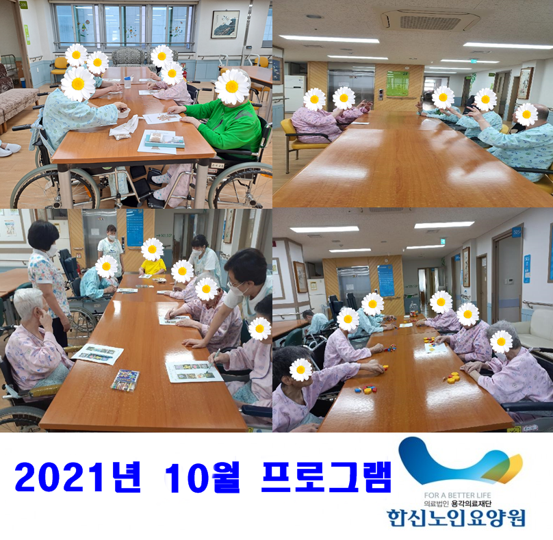 2021년 10월 프로그램 사진입니다. 면봉과 물감으로 단풍나무 표현하기, 허수아비 아저씨 손 유희하기, 가을에 피는 꽃 찾아서 동그라미 하기, 패턴블록으로 은행잎 표현하기 등 다양한 프로그램을 진행하였습니다. 어르신들 모두 즐거운 시간을 보내셨습니다~ >O<!