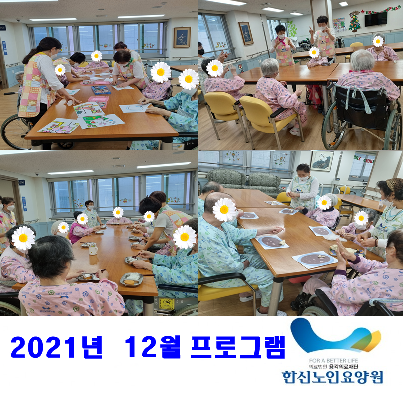 2021년 12월 프로그램 사진입니다. 크리스마스 협동화 그리기, 루돌프 사슴코 손유희하기, 케이크 만들기, 밀가루로 동짓날 새알 빚기 등 다양한 프로그램을 진행하였습니다. 어르신들 모두 즐거운 시간을 보내셨습니다~ >O<!!