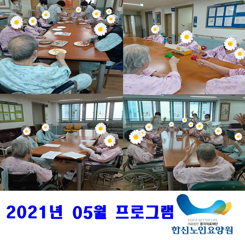 2021년 5월 프로그램 사진입니다. 옛날 과자로 가족 얼굴 만들기, 동요 고향의 봄 들으며 핸드벨 연주하기, 흥부와 놀부 전래동화 함께 읽기, 동요 주먹 쥐고 손을 펴서 손 유희하기 등 다양한 프로그램을 진행하였습니다. 어르신들 모두 즐거운 시간을 보내셨습니다~**