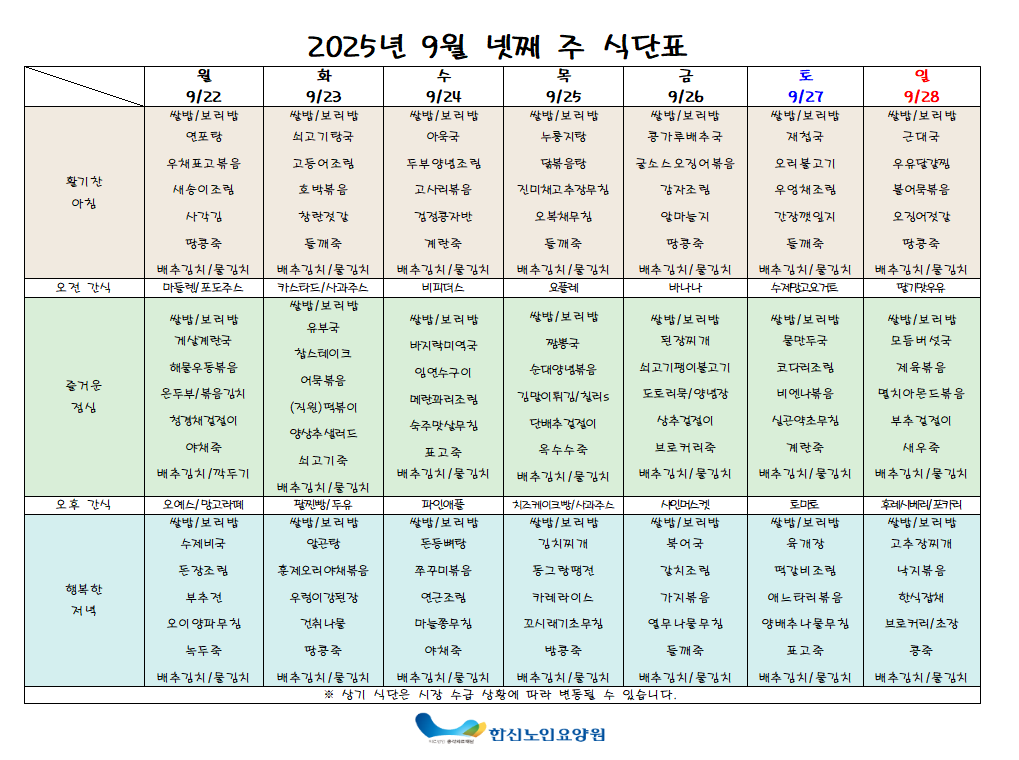 News forum한신노인요양원 9월 4주차 주간식단표 입니다.